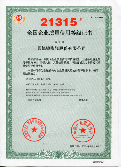 据相识,,,,,,,,荣获《中国21315质量信用品级AAA级证书》的企业可在网站系统上举行盘问。。。。。。。质量信用品级从AAA到D共有10个级别,,,,,,,,AAA级是质量信用品级的最高级别,,,,,,,,意思是产品质量信用“很是好”。。。。。。。