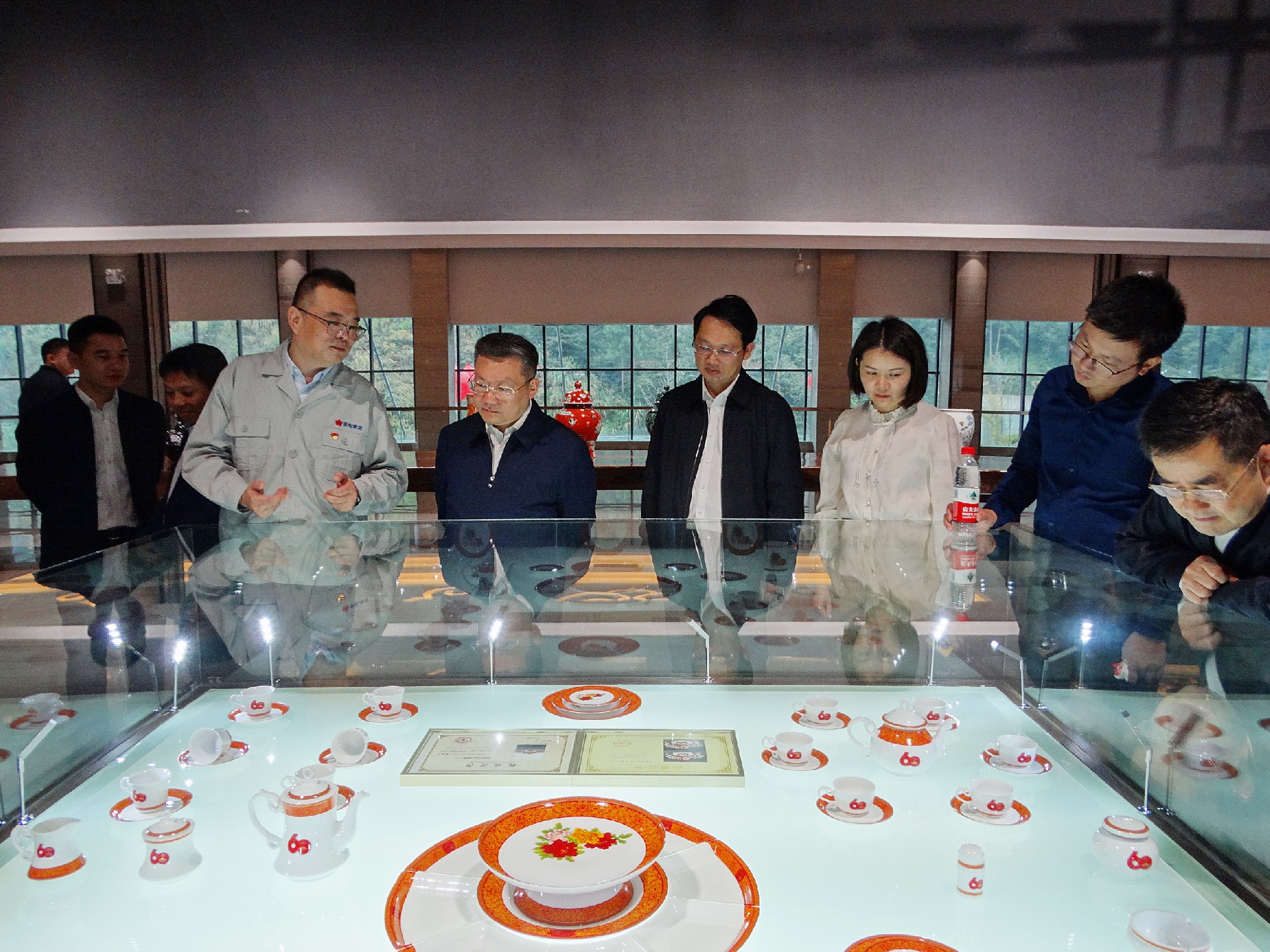 在国瓷馆,,,,,,,胡轶向陈澎一行解说国瓷馆内的基本情形和产品特色。。。。。。各人一起走一起看一起听,,,,,,,胡轶向重点先容了“新中国建设60周年国庆庆典天安门观礼台专用瓷”、“‘瀛台夜话’接待外国元首用瓷”、“古典园林”、“首长专列用瓷”等。。。。。。一个个国瓷故事和工艺细节,,,,,,,引得众人赞叹不已。。。。。。陈澎还仔细询问了企业生产谋划、对外商业等情形。。。。。。